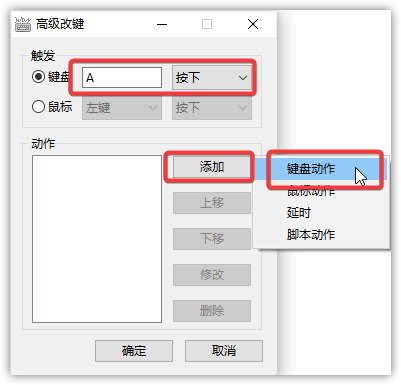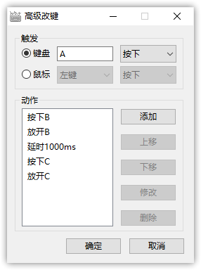 打开使用高级改键,设定触发条件是 A 键按下,动作列表为:按下 B、放开 B、延时 1000 毫秒、按下 C、放开 C: