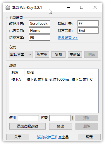溪流 WarKey 支持的改键动作有:键盘动作、鼠标动作、延时和脚本动作: