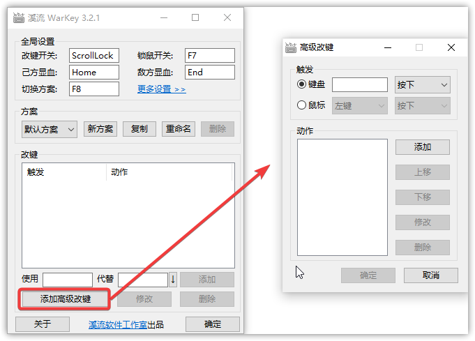 溪流 WarKey 支持由键盘或鼠标来触发动作。