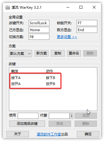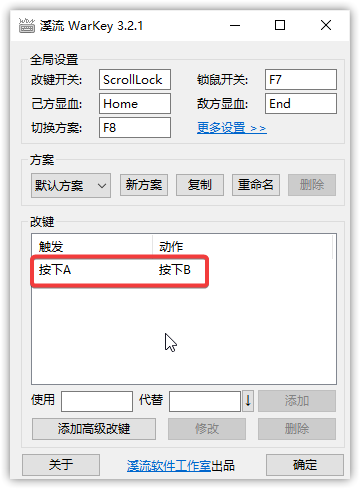 溪流 WarKey 主界面的“使用……代替……”提供了简单快速的添加改键的方式。但也正因为简单,它只能进行两个按键之间的映射,没法使用其他功能。但在大多数情况下,是可以满足基本的使用需求的。