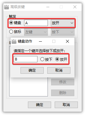 用同样的方法,添加“‘放开A’触发动作‘放开B’”: