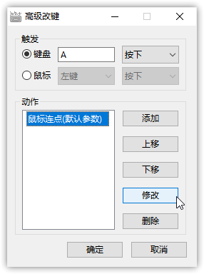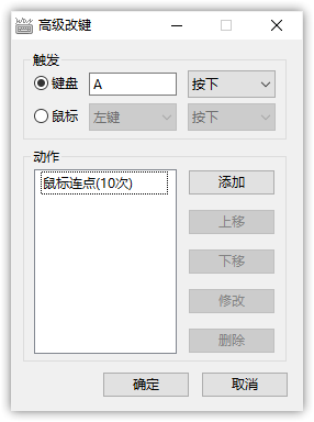 可以看到,由“按下A”触发动作“鼠标连点(10次)”已经成功加入了改键列表中。