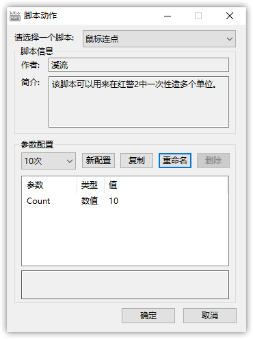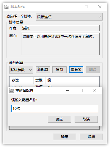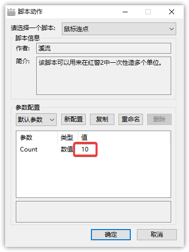 动作列表出现了“鼠标连点(默认参数)”。“默认参数”其实是刚才 Count = 10 的配置名称,在这里很不直观,最好修改一下。