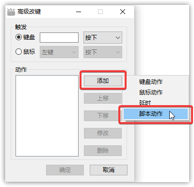 在高级改键界面,选择添加“脚本动作”,便可进入扩展脚本的选择和设置界面: