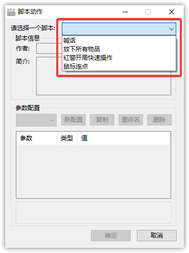 最上面“脚本信息”中显示作者和简介。下面的参数配置中列举了该脚本需要的参数。