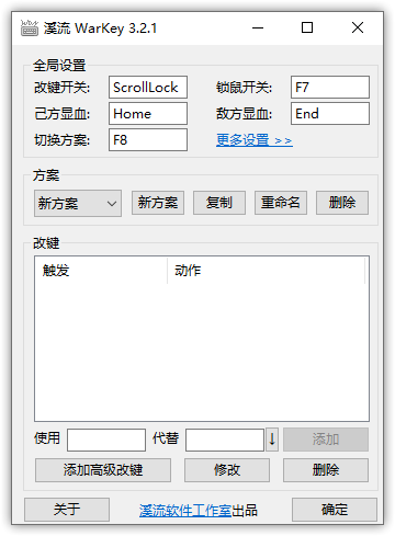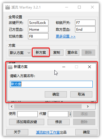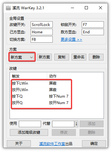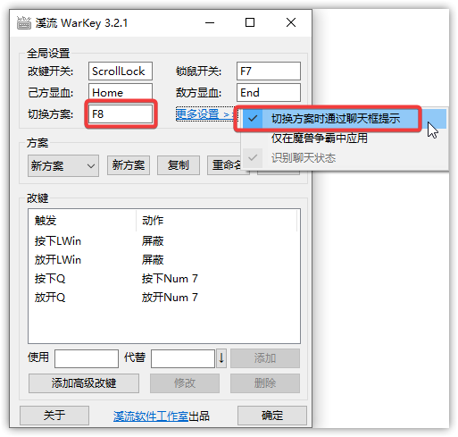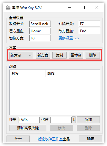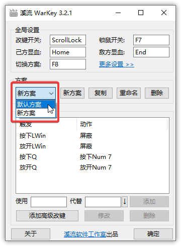 多方案是溪流 WarKey 的首创功能,最初是用于在玩魔兽争霸 RPG 地图“真·三国无双”的时候,针对不同英雄设置不同快捷键。