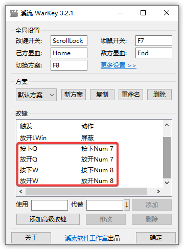 再添加 Q 到 小键盘7 的映射。新方案的最终改键设置如下: