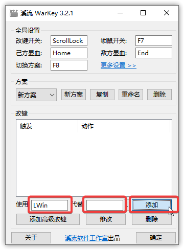 然后我们在“使用”框按一下左侧的 Windows 徽标键,“代替”框留空,直接按“添加”按钮,就可以屏蔽左侧 Windows 徽标键: